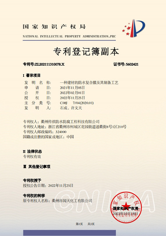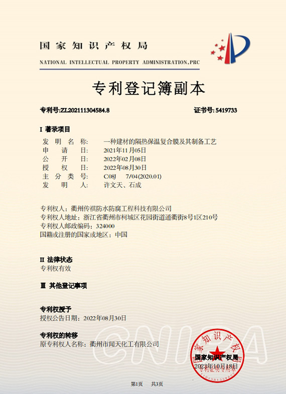 衢州傳祺新材料科技有限公司是衢州市聞天化工有限公司的下屬企業(yè);衢州市聞天化工有限公司成立于2003年,是國(guó)內(nèi)最早研發(fā)、生產(chǎn)氟碳涂料的企業(yè)之一。衢州傳祺新材料科技有限公司成立于2017年,公司專注于高分子氟材料的開發(fā)和含氟材料在防腐、防水領(lǐng)域的應(yīng)用。經(jīng)過(guò)6年的不懈努力,已獲得了化工和建筑領(lǐng)域六項(xiàng)國(guó)家發(fā)明專利授權(quán)和兩項(xiàng)新產(chǎn)品科技成果獎(jiǎng),參與了中國(guó)建筑材料流通協(xié)會(huì)《房屋修繕?lè)浪こ桃?guī)范》標(biāo)準(zhǔn)的編制工作,中建協(xié)涂裝委員會(huì)浙西工作站設(shè)立在我公司。